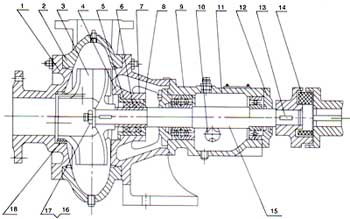 本型排污泵主要由:泵蓋(1),泵體(2),葉輪(3),軸(15),軸封體(4),軸承箱(11))及聯(lián)軸器部件等組成〈見圖1:結(jié)構(gòu)圖〉