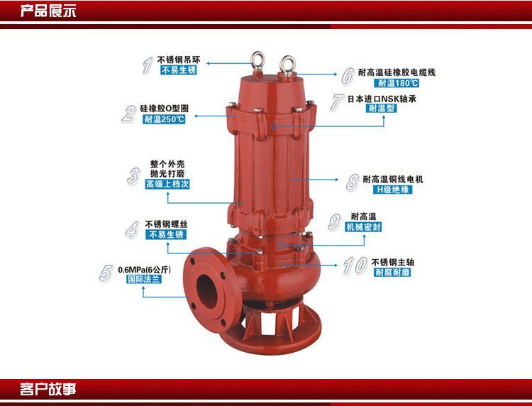WQR耐高溫潛水排污泵是上海沈泉泵閥制造有限公司生產(chǎn)的一款耐高溫水泵其中鑄鐵材質(zhì)溫度可耐80~120℃度,可訂制不銹鋼材質(zhì)溫度可耐200℃度。WQR耐高溫潛水排污泵廣泛適用于企事業(yè)單位如:鋼鐵廠抽送熱水、電廠輸送熱水、熱處理抽送熱水,浴池中心抽送熱水,酒店鍋爐洗衣房熱火輸送、小區(qū)采暖,企業(yè)利用地?zé)崮茉窗l(fā)電,提取地下高溫?zé)崴龋鶕?jù)不同的口徑我們有不同的規(guī)格型號(hào)來(lái)供用戶(hù)選擇。